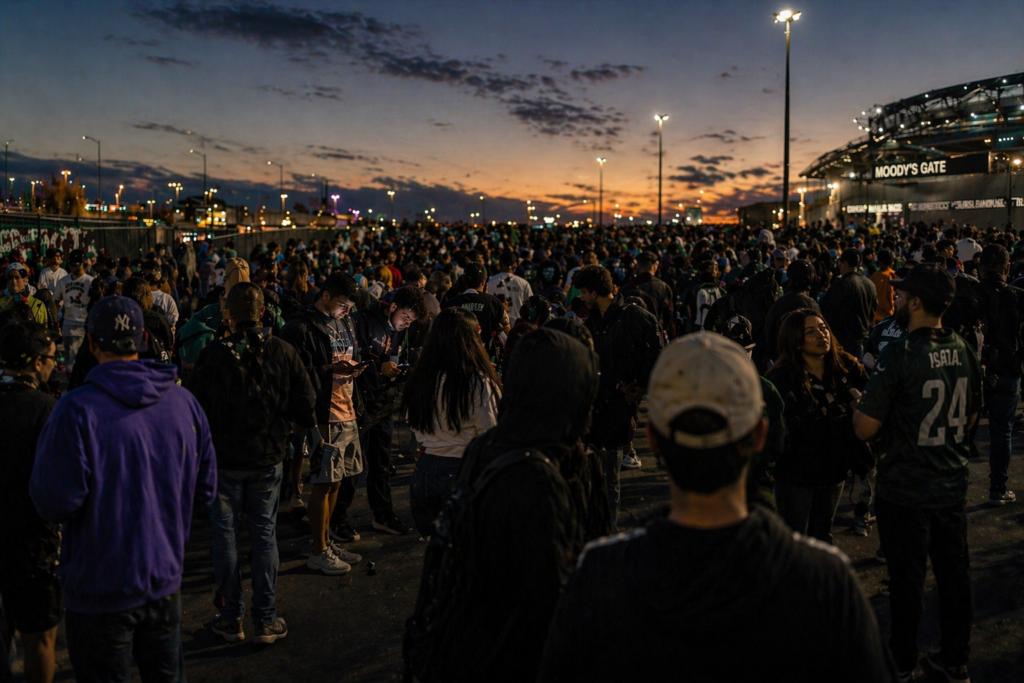 At 6pm, two hours before kickoff, the crowd is already gathering—but not in lines. They cluster in open space, near the perimeter, under streetlights just beginning to take over from the day. Phones glow in their hands. Conversations loop without resolution. Some face the direction of the stadium. Others don’t. No one moves with certainty.
